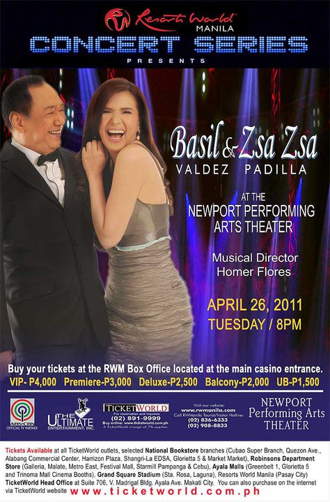 Resort World Manila CONCERT SERIES PRESENTS: A BACK2BACK Concert on April 26, 2011, 8PM at the Newport Performing Arts Theatre, Resorts World Manila. featuring Ms. Zsa Zsa Padilla and Mr. Basil Valdez! Buy your tickets at Ticketworld http://www.ticketworld.com.ph/events/zsazsapadilla.asp
