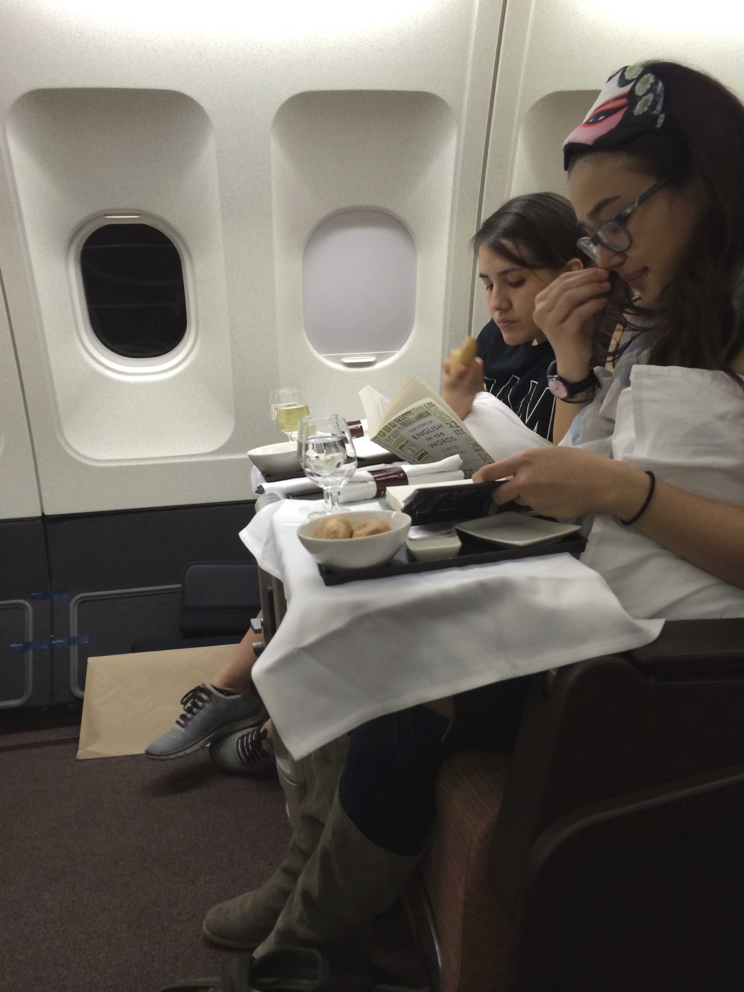 Zia and Coco busy reading while dinner was being served.